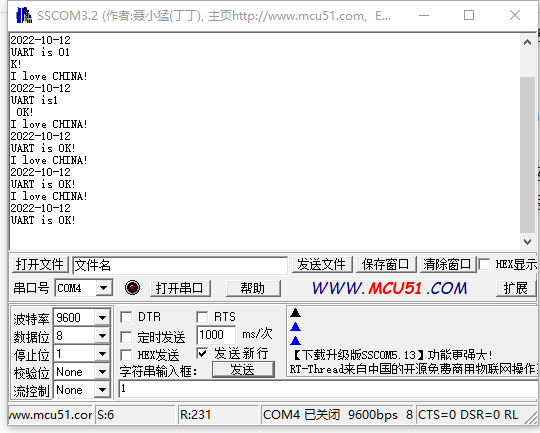编写好程序后按照前面文章中所描述的,将编译好的hex文件下载到板子上,然后将USB-TTL的连线接到板子上对应的串口,另一端USB接入到PC的USB端口。打开PC端串口调试软件,选择对应的串口号和对应的波特率等配置,打开串口,即可在上面的窗口中显示对应的从MCU端发送的字符串内容。