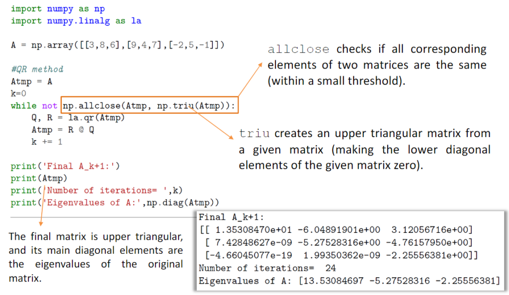 QR分解的一个用处就是用来计算矩阵的特征值,具体的原理不做特别说明,如有兴趣可以参考引文链接。下图说明了怎么用numpy基于QR分解去计算矩阵的特征值。