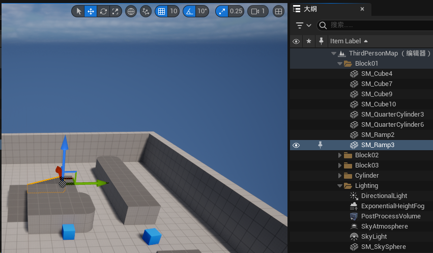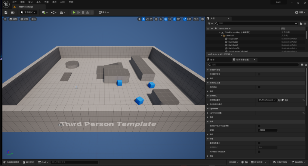 2、关卡编辑器界面:首先新建一个项目,选择第三人称模板(Third Person Template),项目设置选择蓝图,质量预设选择最大,以及填写项目名称后会进入关卡编辑器界面。