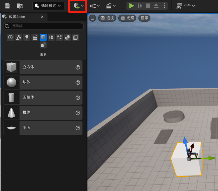 3、放置actor面板:在下图的红色区域点击弹出drop list对话框并选择“放置Actor面板”菜单项,会在程序窗口的左边弹出放置Actor面板,然后在弹出的面板中选择形状,拖入一个“立方体”放入视口中,并通过配置来设置立方体的大小。如下图所示。