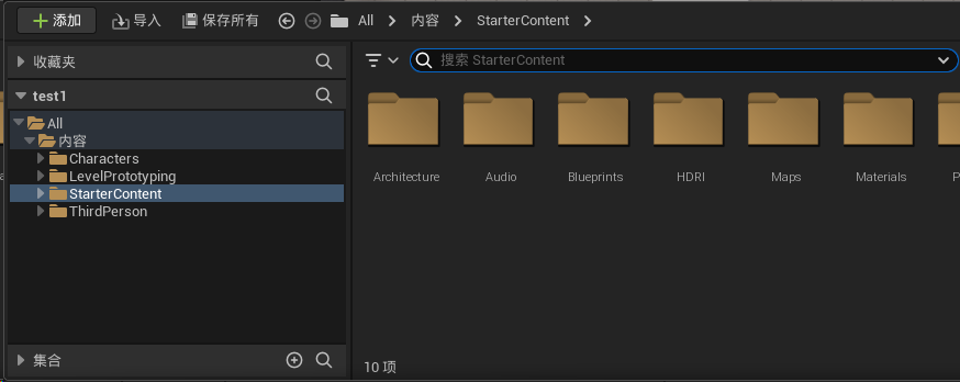 4、内容浏览器子窗口面板:用来管理各类资源,如果在创建项目时勾选了初学者内容包,那么在内容浏览器中可以看到“StarterContent”在我们的项目文件中被创建。如下图所示。