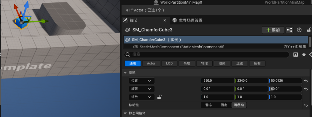 6、细节子窗口面板:当选中任一物体后,其相关细节设置就会展示在细节面板中。我们可以在细节面板中对选中的物体设置坐标、材质、碰撞等属性。