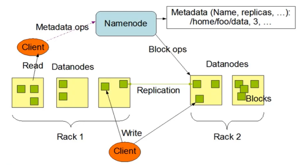 Hadoop HDFS(分布式文件系统),主节点进程(Namenode,存储元数据,文件的目录结构,不同节点之间的负载容量的计算),子节点(Datanode,多个,客户数据存储的地方),如图所示为一个客户端在上传文件时(下方的橙色的Client),将两个文件块上传到两个节点中去,然后文件块再创建对应的副本。HDFS和Ceph都属于大容量分布式存储,但是其实现思想方法和优缺点各有不同,怎么选择和结合使用要到后面有机会再详细介绍。