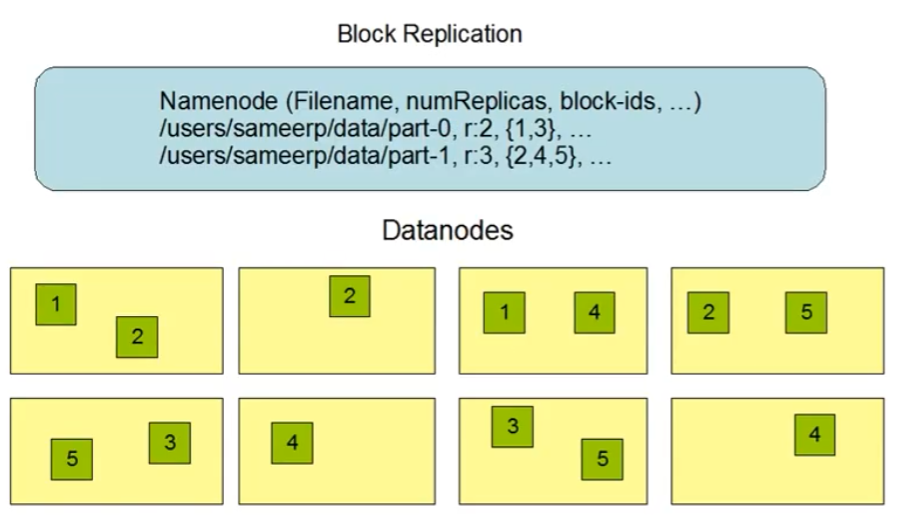 Hadoop中块副本(Block Replication)机制的如下图所示。为文件名,副本数量以及对应的块id号等信息。一般情况下默认副本数为3。