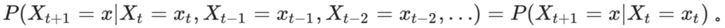 马尔可夫性是概率论里边的一种特性,描述系统当前的状态概率只与上一个状态有关,而与之前的状态无关(或者说由于上一个状态的存在,之前的状态不会直接影响到当前状态)。用公式表示为: