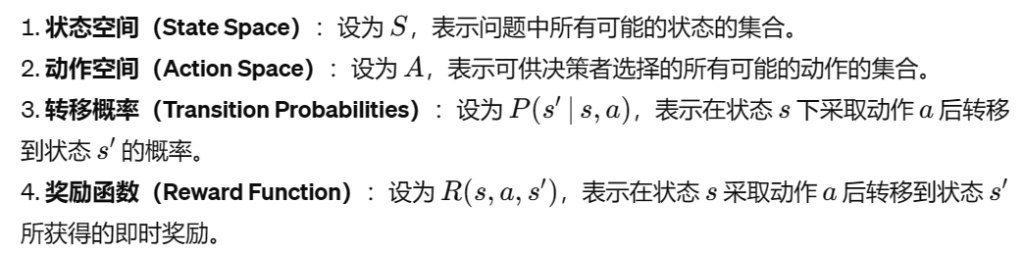 马尔可夫决策过程是对具有离散状态的环境下的决策行为序列进行优化的建模方法。在马尔可夫决策过程中,问题被建模为一个包含以下要素的数学结构:
