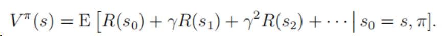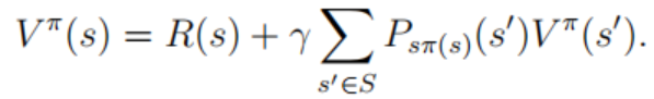 其中s为起始状态,pi为策略,因为在状态s下执行策略pi后下一个状态是概率分布,因此上述公式是期望值。价值函数更有价值的公式为下面的贝尔曼方程。其为一种递归定义: