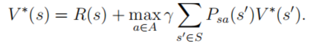 上述公式的最右边可以理解为在当前状态为s的情况下执行策略pi后到达状态s’(满足上述的转移概率)后的价值函数,因为是满足概率分布,所以在不同s‘下求得价值函数的期望值即为结果。最优价值函数即为获取价值最大的策略。这里只关心其贝尔曼方程的表达(因为其方便用程序来实现,后面链接会有相关示例代码去进一步加深理解)。