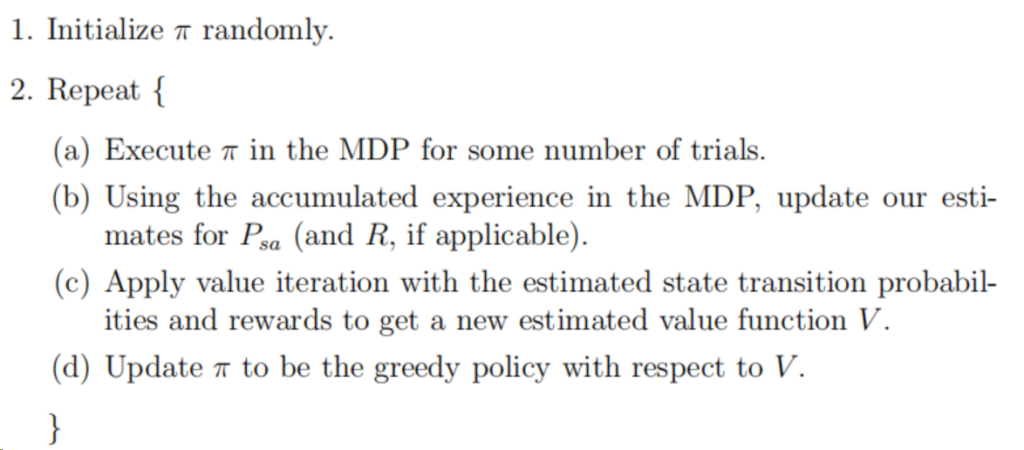 上述MDP的最优策略是在状态当前价值和状态转移矩阵已知的情况下的最优策略求解,实际过程中这些并不是已知的。这里也简要介绍一下MDP在状态转移矩阵未知情况下的求解方法,其也是基于迭代贪婪的思想,从一个随机的策略开始,然后逐步迭代找到更好的策略,在每一个中间策略迭代的开始,要做一些self play,积累一些数据,然后通过value iteration去找到更好的策略,流程伪代码如下所示: