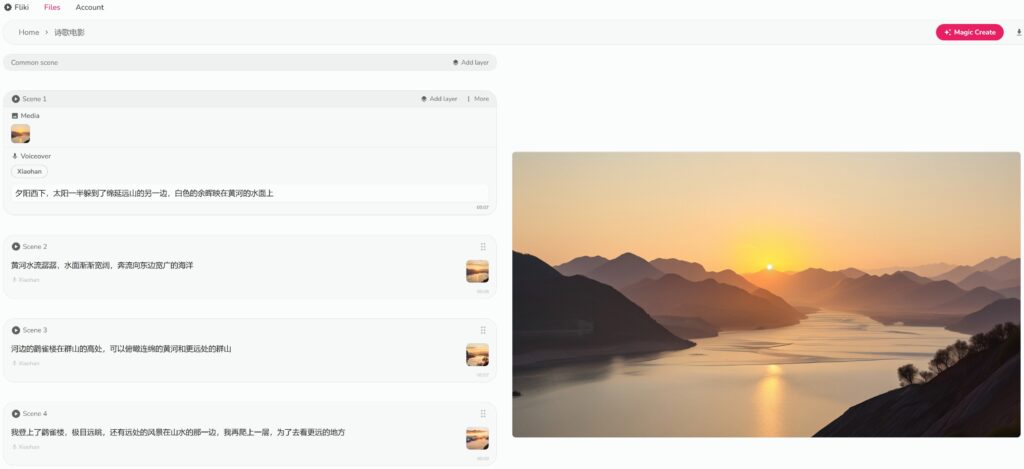 基于上述场景文字生成的图片后,我们就可以再Fliki中去生成这首小诗的短视频了,具体方法为下面的截图演示: