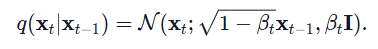 DDPM有前向和逆向过程,前向是从有序到无序的过程,通过不断的向数据样本中添加随机噪声使得数据一般的清晰图像到随机的高斯噪声(熵增过程)。具体公式为(其中beta的取值范围为0-1之间,但随着时间不断增大,亦即模糊化的过程越来越快,关于beta随着时间t的变化可以有不同的scheduler去生成,如线性的,二次的或余弦的):