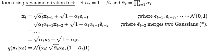 回答:可以确认有快速生成t时刻样本的方法,而不需要经过t次高斯随机函数的迭代计算,这种方法称为重参化技巧(The reparameterization trick)。具体公式描述为: