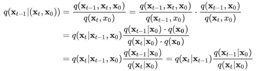 关于逆向过程也可以近似为高斯分布的原因也可以从多个角度进行解释,比如1、从t-1到t的加噪过程可以近似的看成是线性的变换加一个小的噪声,影响较小,可以近似为高斯分布;2、根据贝叶斯公式的变换,同时t-1时候的x(先验分布)也可以近似的看成是高斯分布(根据高斯概率公式的推导,两个高斯分布的乘积仍是高斯分布)。由于在训练时,我们是已知0时刻的原始样本x的,因此在原始样本x0已知的情况下,从t时刻到t-1时候的变化概率可以用如下公式进行建模。