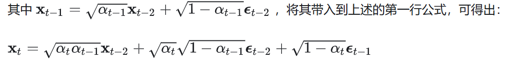 对上述公式的推导过程解释如下,第二行是基于t-1时刻的数据由t-2时刻的数据加噪声生成而来,将第一行的t-1时刻的数据通过t-2时刻的数据生成去替代而得出:
