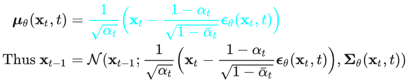 既然逆向过程的每一步变化也服从小的扰动的高斯分布,关键是怎么学习到这样的分布,即均值和方差,在这里主要就是构建一个神经网络,通过输入t时刻的x和t时间特征,就能输出对应的均值和方差。在学到误差之后,就可以通过t时刻的x和误差以及相关的超参数去构造t-1时刻的x,其公式表达如下,其中epislon为学习到误差,sigma(theta)为方差表达式,具体公式的推导可以参考引文1中的详细描述。因此逆向过程可以理解为系统学习到了从无序到有序构建过程的数学模型结构和构建流程算法。