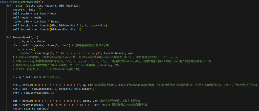 4、DDPM在和生成图像尺寸相同的纯标准高斯噪声空间开始迭代生成清晰图像,其U-Net结构是在二维图像的基础上进行的计算,一般二维图像的数据的训练数据的张量形状为(n,c,h,w),而一般基于NLP的自然语言的训练数据的张量形状为(n, l, e),其中l为输入的token的长度,e为embedding的长度(可以理解为通道数)。下面的一个attention module的实现是基于图像张量上进行的,对代码做了相应的注解。其中用到了einsum和rearrange相关的支持张量的计算和变形的函数。