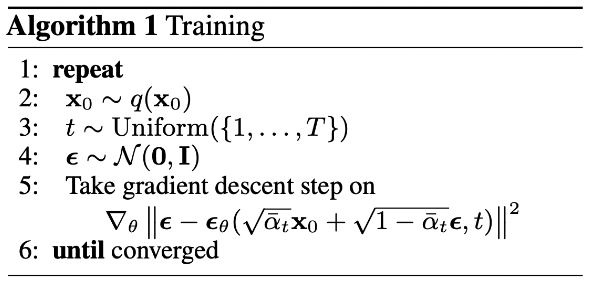 2、基于方差调度(variance schedule)和重参化技巧,训练时样本可以基于从1和T的时间上的均匀采样去获得t时刻的样本(通过x(0)的uncorrupted data和方差调度以及时间t和重参化技巧去一次性求出t时刻的样本,其中error为从标准高斯分布进行的随机采样,如下图中的第四行伪代码所示)。