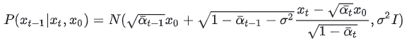 针对上面DDPM的逆向生成过程的效率和性能问题,DDIM算法在逆向采样方面进行了重新的建模,支持在不需要重新训练DDPM已经训练好的模型的基础上,通过新的采样方式,减少采样步骤,同样能够达到生成高质量图片的效果。通过拟合条件概率分布,得出的结果为:
