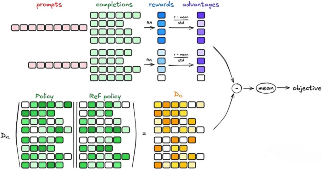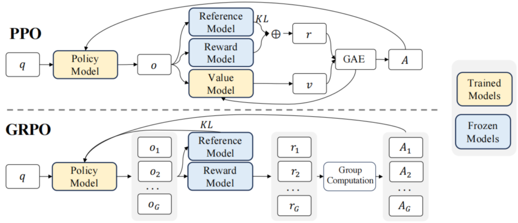 PPO算法在rollout时基于一个prompt生成一个response(completion),而GRPO中会基于一个prompt生成多个completions,图1为两个算法的优势函数定义对比图。PPO算法的优势函数的公式中[1]有依赖于即时奖励和价值函数的计算,而GRPO算法中没有Value Model,从而省去了训练时Value Model的推理和梯度更新的计算资源。GRPO的优势函数的计算方式可以参考[2],其基于生成的多个completions分别用奖励模型去计算奖励,然后基于多个奖励值进行归一化(减去均值除以标准差)后得出优势函数的计算结果,这也是群体相对策略优化(Group Relative Policy Optimization)名称的由来。