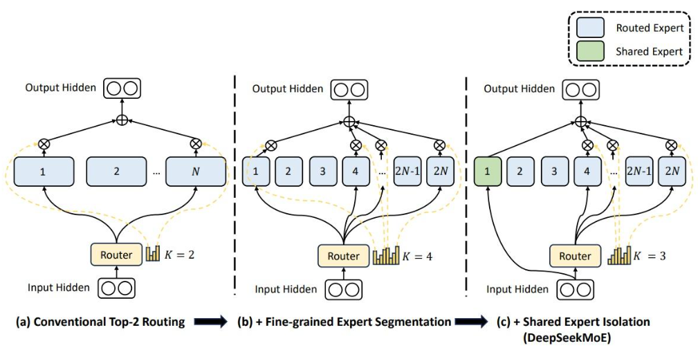 DeepSeek-V1模型在MoE的设计上做了两处的改进,具体如下图所示:(1)、细粒度的专家模型分割,采用了更多的专家模型子模块;(2)、采用了共享专家模型,学习通用知识。