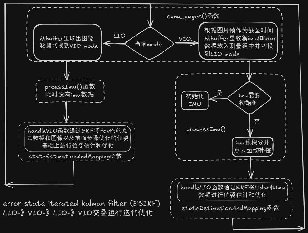 基于ROS1平台,整个流程是while循环,循环体内的流程以VIO和LIO迭代交替循环执行(如图1所示),这也是error state iterated kalman filter (ESIKF)的实现所需要的逻辑。