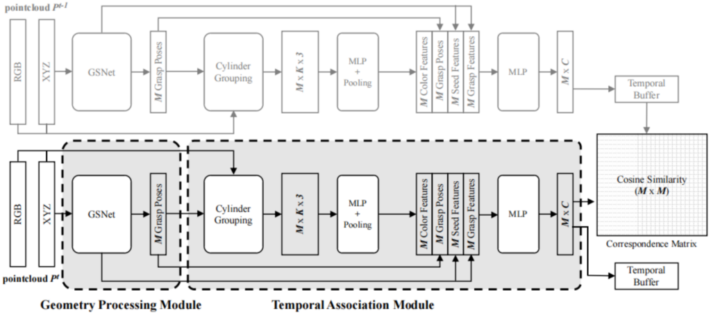 其更多的创新之处在于在空间几何处理模块(左边GSNet部分)的基础之上,添加了一个时间相关的模块(Temporal Association Module)来实现抓取位姿的跟踪功能(grasp pose tracking),该跟踪模块主要组成为(具体可以将解释和图1中的结构图进行对照理解):1、特征提取功能,纹理和颜色可以给tracking提供相关的线索信息,对于种子点的的approaching vector和GSNet中的基于cylinder grouping的特征分组类似的方法对点云的颜色信息进行聚合计算并通过MLP和Pooling后形成颜色特征;2、特征组合功能,和GSNet前向过程形成的相关特征拼接后连接MLP形成M个种子点的夹爪位姿的C个通道的feature输出,并和在时间Buffer里存储的上一帧的夹爪姿态的C个通道特征输出计算相关性(如通过计算特征间的余弦夹角来获取特证间的相似度得分similarity score,形成M*M的对应矩阵correspondence matrix)。在计算loss时,根据上一帧的每一个位姿,将当前帧与其距离在一定小范围内的抓取位姿集合一起计算损失函数,损失函数定义思路为增大相似姿势的相似性抑制距离较大姿势间的相关性,具体可以参考[1]中的公式描述。