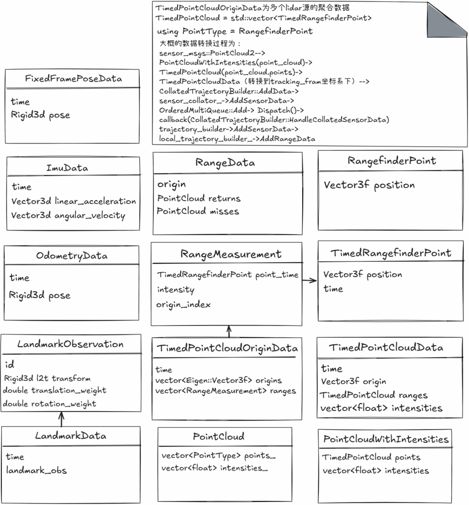 如下图所示为cartographer系统(包括ros节点)代码中数据相关的类图。其中左边一列为IMU,Odometry等其他传感器的类图,右边两列为Lidar传感器相关类图,其中右上方描述了Lidar数据在系统中的流转转换流程过程。