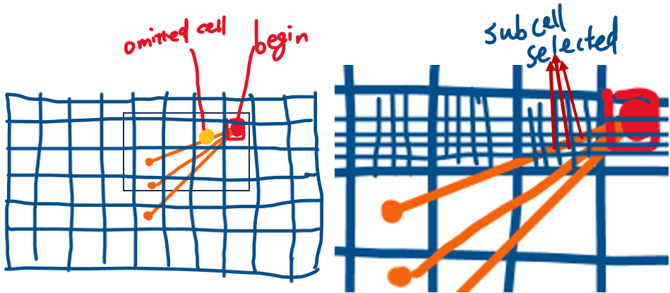 如图1左图所示,由于黄色点所在cell的index和begin的y坐标相同,但x坐标比begin还要小,Bresenham等光线追踪算法可能判定如图所示的三条光束“跳过”了本应标记为 “miss” 的单元格。右图通过进一步细化分辨率,可以看到光线在原先大的单元格的小的单元格的cell的y轴坐标会比begin要大,红色箭头表明这些sub cell会被选中,因此超分辨率主要解决miss” 单元格由于离散化和单元格尺寸过大而导致的精度损失问题。