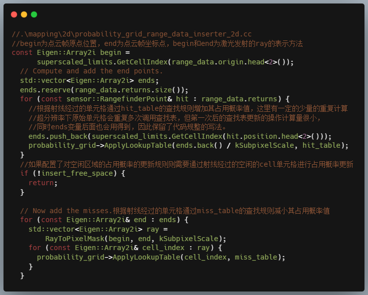 在基于概率的地图表示方法的基础上,其再次用到了一些技巧实现了高效的计算,如将概率值转化为无符号短整型(具体的实现在代码文件probability_values.h里),以及将短整型分成左右两半区间,以保证同一个点云帧的所有点云的遍历时概率栅格地图的单元格的值最多只更新一次(更新逻辑在CastRays函数里实现)。接下来根据代码加以分析根据点云帧建图的逻辑。这里关于地图更新的逻辑将以问题的形式进行说明。