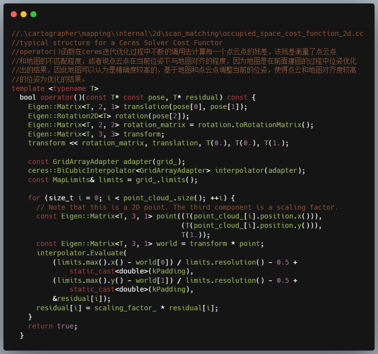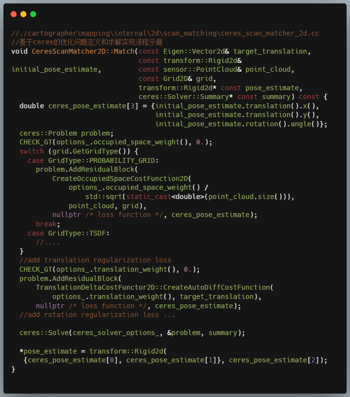 关于ceres的非线性优化方法的一点说明,其采用了自定义的损失函数和正则化的约束损失函数相结合的损失函数定义,自定义的损失函数的总体思路是对点云点基于位姿做坐标变换后和较为准确的地图数据做对照计算,如点云点总体上处理在概率值较大的或TSDF值接近0的栅格位置附近,则损失函数较小,否则偏移越大损失越大,通过调整位姿使得损失函数较小时的位姿为更加和地图匹配和对齐的位姿,具体实现上通过位姿损失函数和正则化约束函数采用ceres非线性优化库实现对位姿的优化求解。代码片段示意如下: