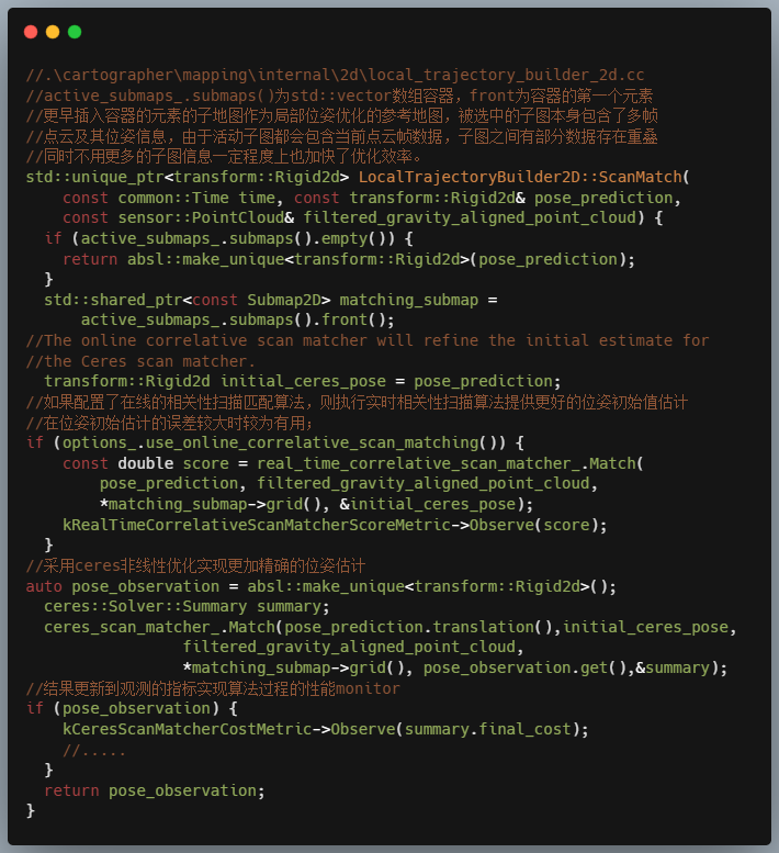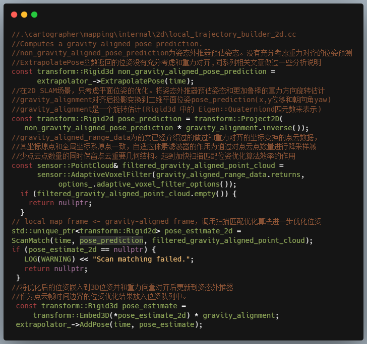 这篇文章将向大家介绍cartographer系统中2D SLAM中的扫描匹配算法,该算法基于姿态外推器的车体位姿估计初始值和点云帧信息实现了位姿估计的进一步优化。下面将对其实现代码和注释做具体的说明分析。